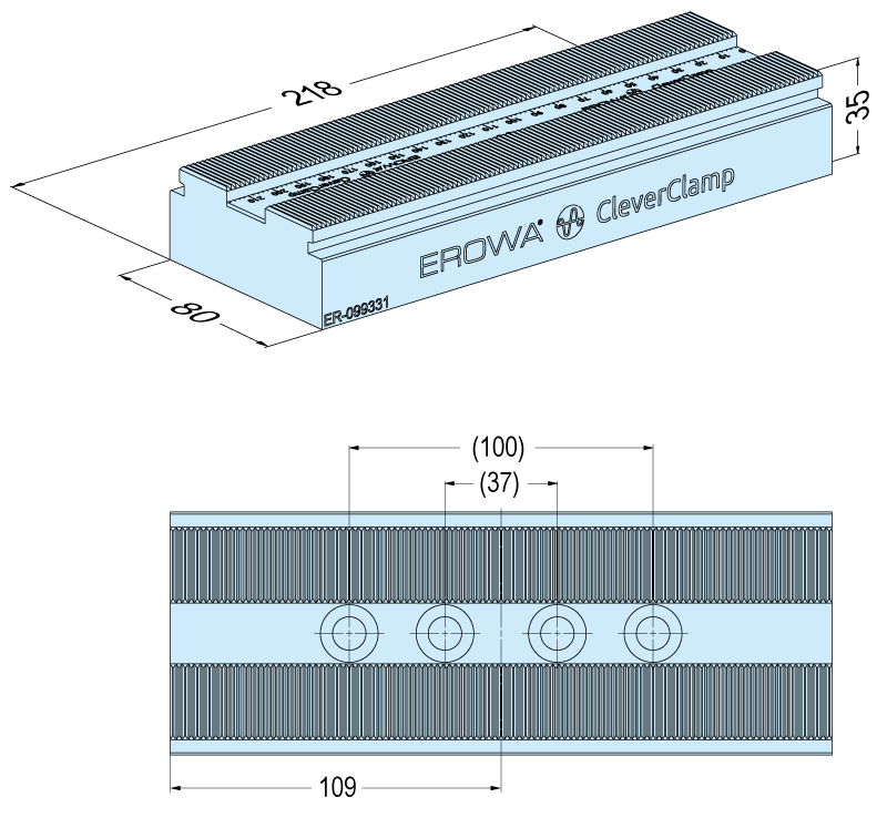 Steel, hardened. Clamping element carrier, length 218mm, height 35mm, with 2mm positioning grid.