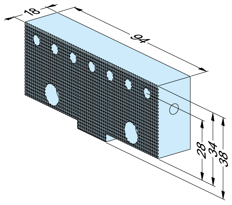 Steel, hardened, width 94mm, height 34mm, one side smooth, the other with grip contours.